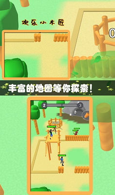 欢乐小木匠内置功能版是一款融合多元素玩法的休闲益智游戏,创新性地将资源采集、建筑规划、角色成长与策略防御相结合。玩家通过指尖滑动即可操控角色移动路径,在森林场景中收集木材资源,搭建不同功能的建筑设施——木材加工厂实现自动化生产,铁匠工坊提升角色属性能力,多样化的建筑体系让每次规划都充满策略乐趣。
