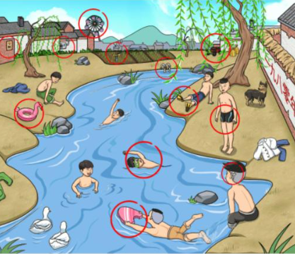 本关卡时间线锁定在1980年夏季,画面呈现典型的北方露天池塘场景。木质跳台、手缝泳裤、铁皮水桶等物件精准还原时代特色,玩家需结合历史背景辨识现代产物。