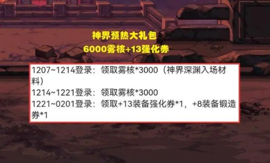 【12月14日-12月21日】第二阶段继续发放3000雾核,双阶段累计获取量达6000个。建议玩家合理分配使用时段,可将部分资源预留至新版本更新后,配合神界副本的首次通关奖励实现收益最大化。